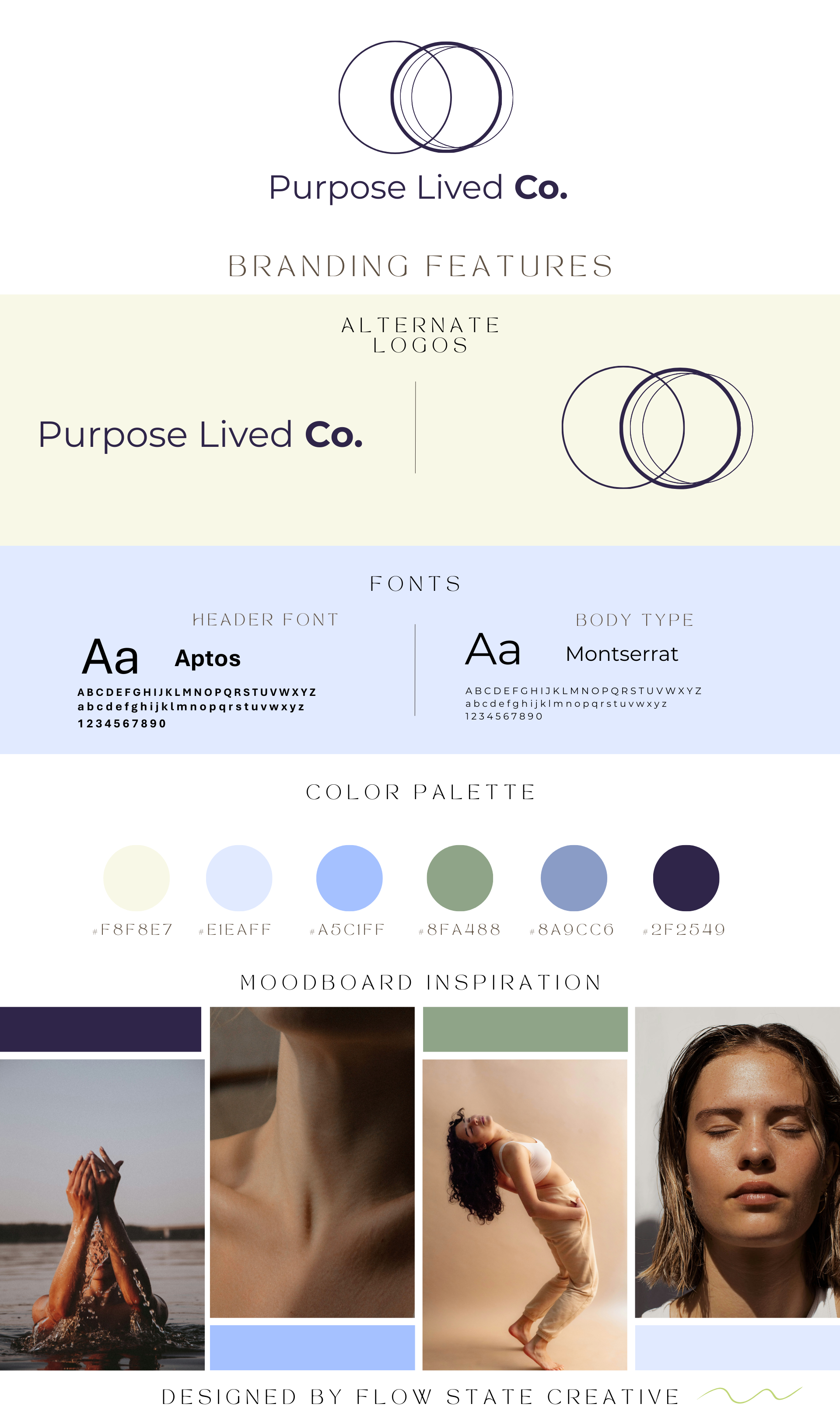 We consolidated everything under Purpose Lived Co. with a contemplative visual identity: colour palette moving from soft neutrals through sage and periwinkle into deep purples—a visual journey mirroring the inner transformation her clients experience.
